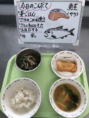 今日は、「さけの黄金焼き」で焼かれたみその風味が香ばしい、ごはんにぴったりのおかずでした。