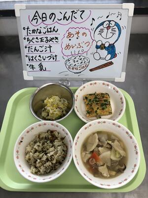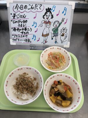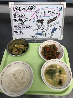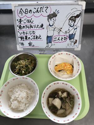 今日の給食では、「豚肉と里芋のあげからめ」がごはんのすすむ味でした。