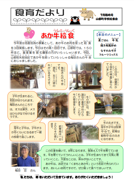 今日は、山都町の地産地消の取組により、矢部地区の畜産農家の方からあか牛を提供していただきました。