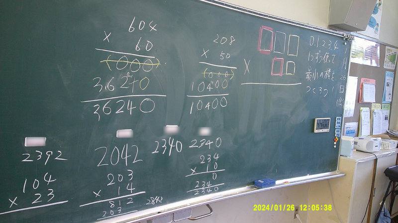3年生は、3ケタと2ケタの積の筆算の演習が本時の内容です。4年生は、日野との深度の違いも予想されるので「総合問題 4を4つと演算記号等を使って計算結果が0~9になるようにする」を行いました。
