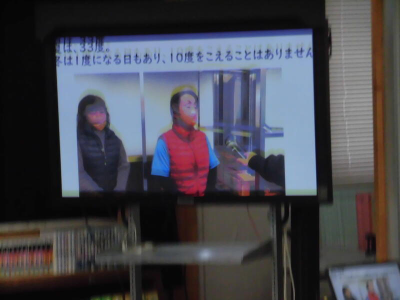 続いて、健康委員による調理員の先生方へのインタビューの様子が流されました。暑さ・寒さの大変厳しい環境で給食をつくっておられることがわかりました。