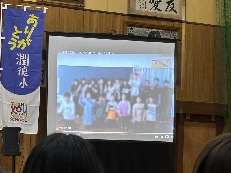 (日野)潤徳小全校児童・全校職員出演によるメッセージ動画が送られてきましたので、会場全員で視聴しました。学年3~4クラスもあるマンモス校ですので迫力があります。会場におられた日野4名の先生も、観ていて感無量だったことでしょう!