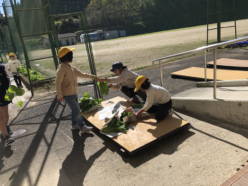 収穫した小松菜は、給食用および持ち帰り用に分けられました。
