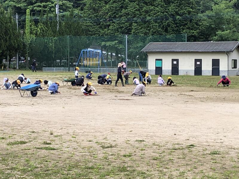 1・2年生は、「なにやってるのかわからな~い」「5年生だけで人数が多い」とか言ってました。本音でしょう。山本Tが「一緒にやってみたい人?」と聞くとこの通りたくさんの手が挙がりました。子どもたちは、とにかく作業が好きなんですね。