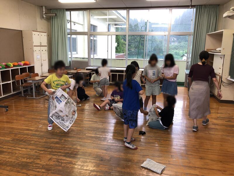最後は新聞紙で球をつくって、玉入れをしました。この時間、4年生以下は全員が参加していました。