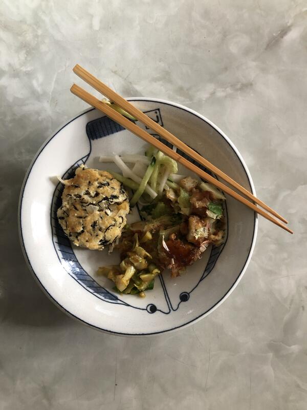 ※お品書き お好み焼き・豆腐ハンバーグ・キュウリとモヤシのナムル