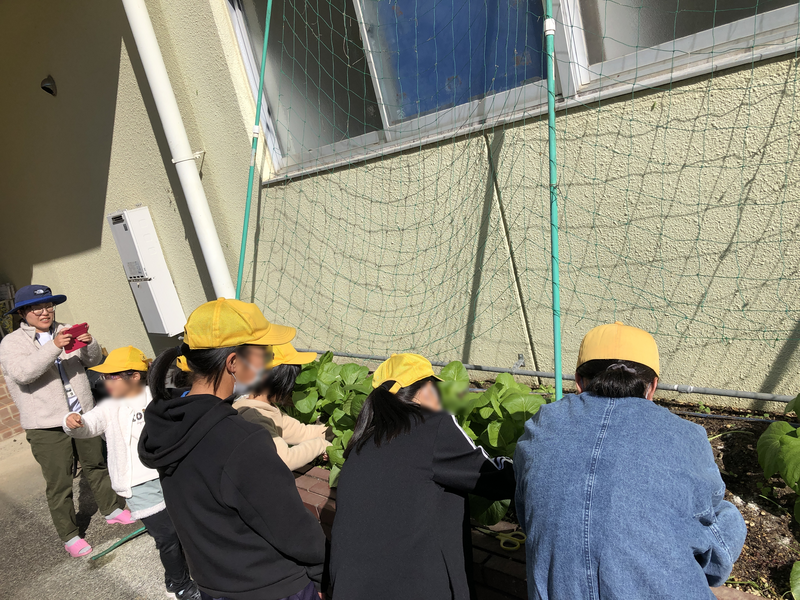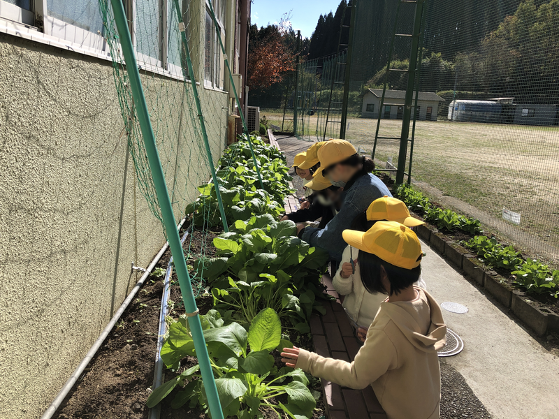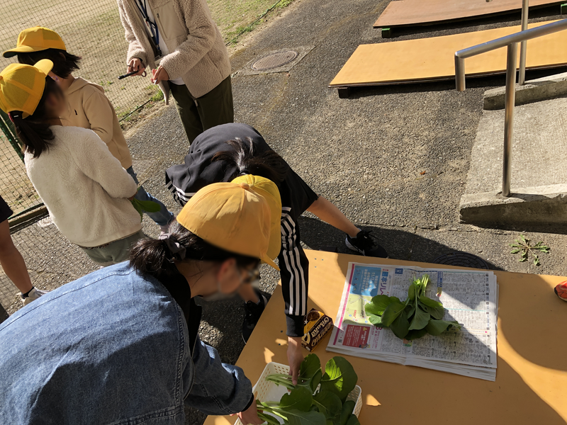 潤徳農園の小松菜収穫をする人を給食の放送で募集しますと、1年生と6年生の7~8名ほどが集まりました。
