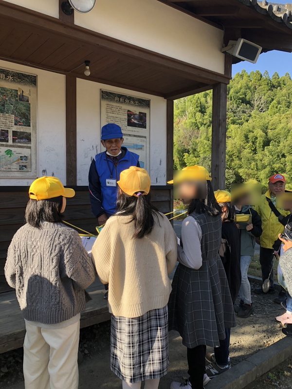 円形分水の説明を聴いています。このあと水路1.5kmを歩きます。