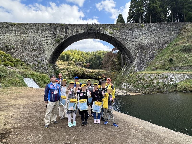 通潤橋の前で集合写真!日本一充実した通潤橋学習ができたようですね!