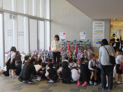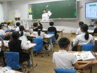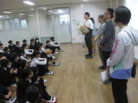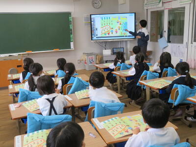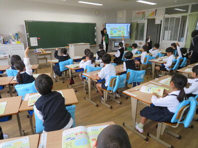 昼休みは、武道場(3・4年)、体育館(1・2年)で、英語を使った楽しいアクティビティが行われました。ALTの先生方はAll Englishでしたが、子どもたちはしっかり聞き取って、ゲームを楽しんでいました!5校時は、5年生(1・4組)が多目的室で活動しました。日本のおすすめの観光地をALTに英語でプレゼンしていました。説明はもちろん英語。自分たちで説明を考え、タブレットで写真を見せたり、フリップを作ったりして、わかりやすい説明ができていました。学んだ英語が役に立つ経験をしたことで、外国語を学ぶ意欲がさらに高まったことと思います。ALTの先生方、本校英語専科の日髙先生、大変ありがとうございました!「Thank you for coming to school today!!笑う」(主幹教諭 濱坂 由紀美)