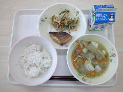 麦ご飯、牛乳、豚汁、メバルの照り焼き、茎わかめともやしの和え物