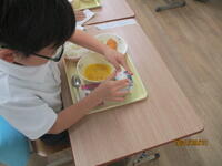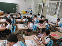 2年生の音楽は、「かぼちゃ」という曲を学習しました。歌ったり、手拍子したり、楽器(トライアングル、カスタネット、鈴など)を使用したりなど、ノリノリで楽しんでいました。私も思わず手拍子で一緒に楽しみました。