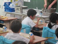 本日の給食から牛乳のストローがなくなりました。地球にやさしい環境づくりの観点からプラゴミを減らす目的でストローレス容器になりました。子どもたちは、容器を開いて、直接口につけて飲みました。「1年生は大丈夫かな?」と思い、見に行くと上手に開けてこぼさないで飲んでいました。えらい(^^)(校長 佐藤 政臣)