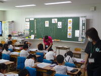 コロナ禍以前は、合志市内の学校を元アナウンサーの岩元先生が回って「ことば教育」が行われていましたが、今年度から復活しました。先日早速3年生に指導していただきましたが、今日は1年生の指導にお見えになりました。クラスごとに発声練習から詩の朗読に取り組みました。みんな口を開けてハキハキと詩の朗読ができるようになったみたいです。(教頭 米澤)