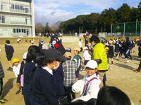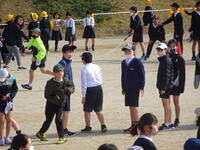 たくさんの子どもたちが運動場に出て、自分のペースで5分間走りました。