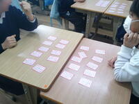 ③先生が読み札を読みます。すばやく取り、10枚以上取った方が勝ちになります。