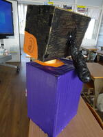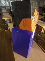 本校の児童が「担任の先生の像を作りたい」と思ったようで、家で制作に取り組んでいたそうですがこのほど完成して学校に持ってきました。段ボール箱でつくられたものですがとてもよくできています。このような立派な像を自主的に作ってもらって担任の先生も大変感動しておられました。みなさんはどの先生の像だかわかりますか?(教頭 米澤)