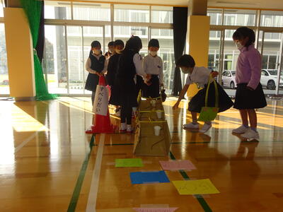 2時間目、体育館で1年生の生活科「あきのおもちゃランドであそぼう」が2年生を招待して開かれました。1年生の生活科で、お隣の菊池恵楓園で探してきたどんぐりや松ぼっくりなどを材料に作ったおもちゃ(けんだま、マラカス、ボウリング、すべりだい、めいろ、こま、やじろべえ)のお店を班で開いて、2年生のお兄ちゃん、お姉ちゃんに遊んでもらい、「おもてなし」をしました。