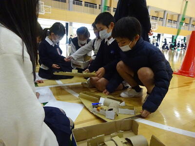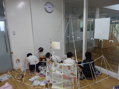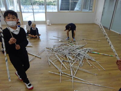 週末の金曜日の5・6時間目、一週間の最後の時間です。4年生3クラスは、この日のこの時間にあわせて、図工「つなぐんぐん」の授業をいれてありました。新聞紙で筒を作って、それをつなげて、創造物を作っていく学習です。1組は小多目的室、2組は武道場、3組は大多目的室に移動し、まずは筒を大量生産!その後、グループで思い思いに「つなぐんぐん」。子ども達の発想はどこまでも伸び、とめどなく広がっていきます。