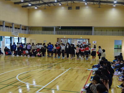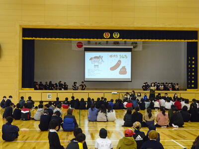 学習したことについて各学年からの発表と他学年からのお返しや感想を出し合いました。体育館や武道場で、ちょっと寒い中での集会でしたが、子ども達の発表は心が温かくなるような内容で、他学年交流もでき、とてもいいたてわり人権集会となりました。
