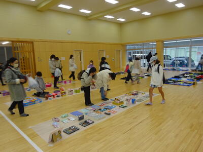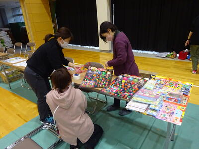 バザー会場となる武道場で夕方から、担当サポーターとPTA役員の方々で事前の準備が行われています。PTAの皆様にご提供いただいたバザー用品が剣道場いっぱいに並べられています。「えっこれも!」「これいいな」と教職員もテンションがあがるほどの品ぞろえです。無料の標準服コーナーもあります。