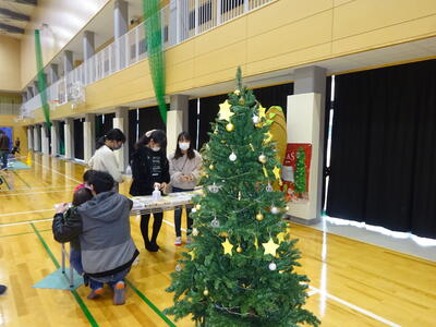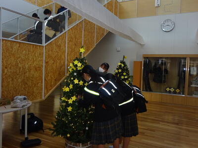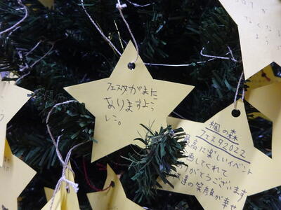 17日(土)の楓の森フェスタ22で会場に設置されていたクリスマスツリー2本は、1階の東ロビー(職員室前)に置かれています。登校後、休み時間には、小学生だけでなく中学生も星形の用紙に願いごとを書いてツリーに託しています。受験を前にした3年生の願いもある中、よほど楽しかったのか「フェスタがまたありますように」をサポーターの方々にとってうれしい願いごともあります。