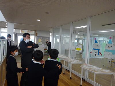 2組の子ども達は、休み時間に「雪だるま」の前を通る先生方に「ちょっといいですか?」と声をかけ、「どの雪だるまがいですか?」と投票を呼びかけいます。中学校の教務主任の井上先生にも臆することなく声をかけるなど、コミュニケーション能力を発揮しています。これもこれまでの学習の成果です。