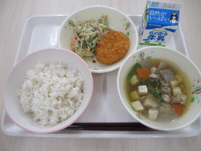 麦ご飯、牛乳、かしわ汁、牛肉コロッケ、ごぼうサラダ