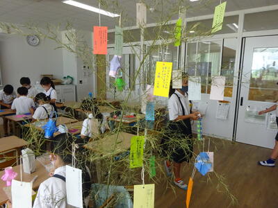 7月7日七夕。4年生の教室には笹竹が持ち込まれ、昨日(6日)の昼休みには4年生の子ども達が願いごとを書いたり、飾りをつくったりしていました。「〇〇が上手になりますように」「〇〇大会で優勝できますように」「〇〇になれますように」といった自分の願いや「家族全員がけんこうでいれますように」などの願いが書かれいました。