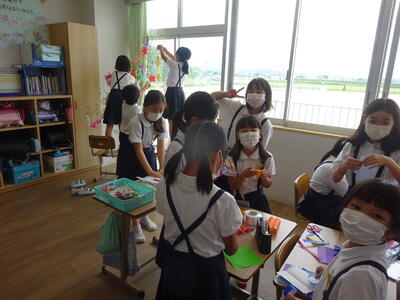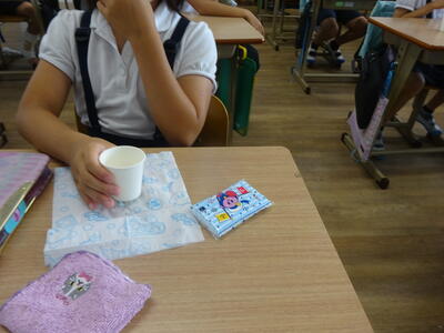 7月に入り、市教育委員会の前述の指針が変更され、学級閉鎖している学級以外は、感染予防対策をとってフッ化物洗口を実施することなり、本日、久しぶりに実施できました。むし歯予防予防の一つとして歯みがきと併せて、希望者に実施していきます。