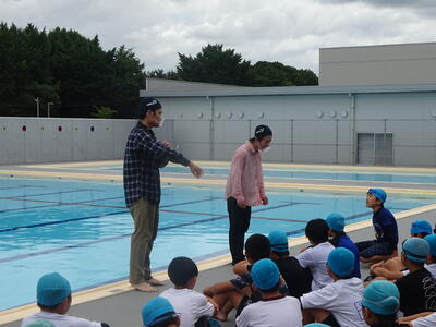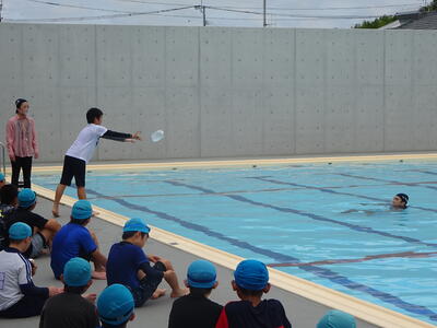 溺れている人がいたら、自分が助けようとしないこと(溺れている人は、必死になっているため、強い力でひっぱらえれ二次被害となる)。助けを呼びに行くこと。また、浮き輪の代わりになるペットボトルやランドセルなどの使い方などについて実演を交えて説明がありました。