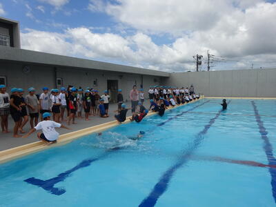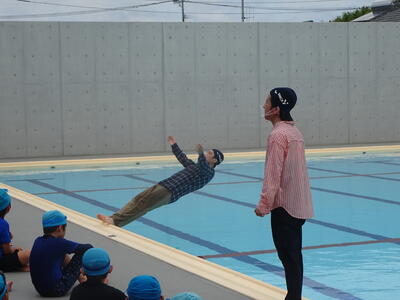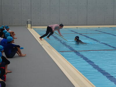 その後、子ども達は、服を着たままプールに入りましたが、プールサイドに座って後ろ向きになってプールに入ることで、実際に溺れる状態を再現されていました。子ども達からは「こわい」「(服をきていて)重たい)などの声が聞かれ、水着とは違った感覚を体験できたようです。