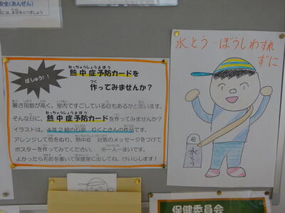 そのぬりえは、「熱中症予防カード」と名付けられています。もともとは、4年2組の石原りくとさんが描いたイラストです。4年2組の「遊び会社」のりくとさんが、熱中症予防のためにクラス向けに作成して「水とうをもっていこう」と呼びかけていたのを目にした保健室の山下先生が「これだ!」と思い、りくとさんの了承を得て、保健室前の掲示板に「熱中症予防カード」として設置しています。きちんと熱中症対策まで行う4年2組の「遊び会社」の危機管理の高さもさすがですが、校内の子ども達の意識付けに大きく貢献している「遊び会社」です!