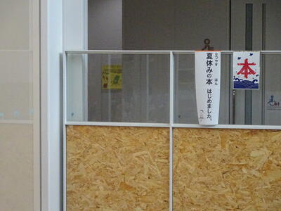 図書室前の吹き抜けに「かき氷はじめました」ならぬ「夏休みの本 はじめました」の垂れ幕が今日から掲示されました。