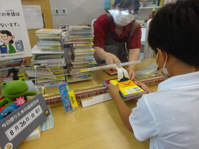23日からの夏休みに向けて、今日から本の貸し出しが始まりました。一人3冊を借りることがで来ます。各クラスが図書の時間や休み時間を使って、お気に入りの本を借りています。