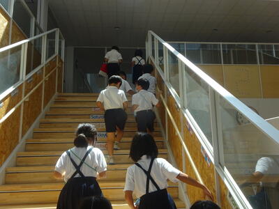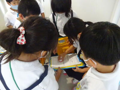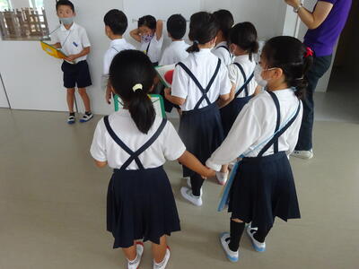 「ここは理科室です。3年生からつかいます。実験などもします。」と1年生に説明したり、「廊下は右側をあるくんだよ」「授業があっているので、しずかにね」「つぎは、1階の保健室だよ」「スタンプどうぞ」などなど、2年生は1年生にやさしく声かけをしたり、一緒に手をつないで歩いたり、そっと背中に手をあてたりと、お兄さん、お姉さんぶりをしっかりと発揮してくれていました。頼もしい2年生の子ども達でした。