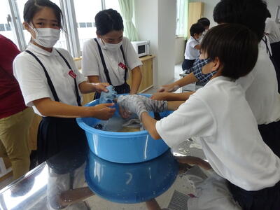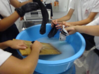 6年生の家庭科は、楓の森中の家庭科の小山先生に授業を受け持ってもらっています。今日は、たらいで洗たく板を使って、「もみ洗い」「こすり洗い」「つまみ洗い」でした。家から使用済みの靴下を持ってきての実習です。途中、手袋のようにして「こすり洗い」をしている子どももいましたが、楽しみながら、しっかりと汚れを落としているようでした。