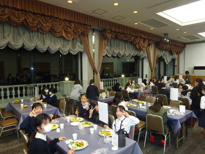 夕食会場で入館式を行い、お世話になるホテルの方に挨拶をして、待っていた夕食。バイキング形式で、楽しみのデザート付き。ホテルの方から「追加をするのでいっぱい食べていいですよ」の言葉に思わずガッツボースをする子ども。それぞれの料理は、子ども達が食べると追加、追加の連続、おなか一杯、それぞれが好きなものを食べていました。エビフライ20尾ほど食べた強者もいました!。バイキングの野菜も何度も追加され、ホテルの方からは、「いつも野菜は余る方だけど、これだけ野菜を食べる子ども達は初めて」と言わしめるほど、バランスよく?!食べていた楓の森小の子ども達でした。