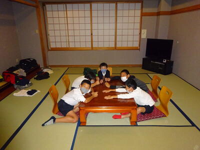 ホテルでは3階と5階が男子、6階と7階が女子の部屋となっています。3階は和室、5階が洋室の違いはありますが、とても広く快適なようで子ども達もそれぞれ堪能しています。部屋の靴やスリッパも学校と同じできれいにそろえています!!