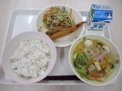 麦ごはん、牛乳、タイピーエン、ししゃもフライ、野菜の甘酢和え
