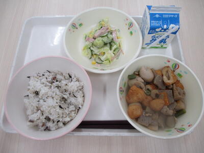 梅ひじきご飯、牛乳、筑前煮、味噌マヨネーズサラダ