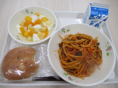 パインパン、牛乳、スパゲッティナポリタン、フルーツ杏仁