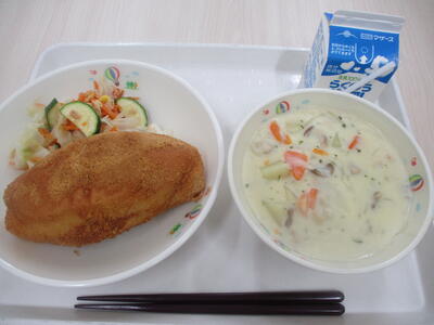 揚げパン、牛乳、クリームシチュー、ズッキーニのサラダ
