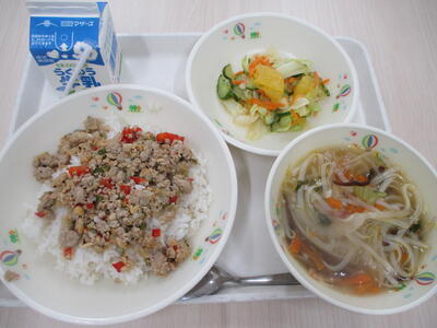 ガパオライス、牛乳、クイッティオのスープ、甘夏サラダ