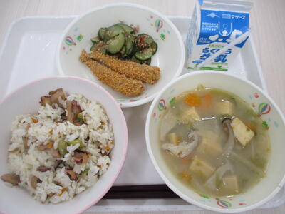 たこめし、牛乳、あおさの味噌汁、いわしのカリカリフライ、きゅうりのおかか和え