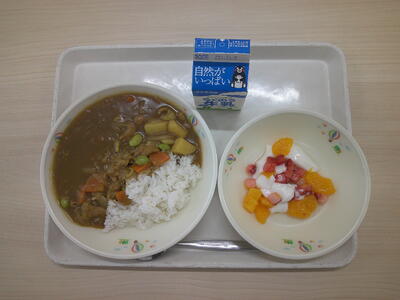 ポークカレーライス、牛乳、イチゴ入りフルーツ杏仁