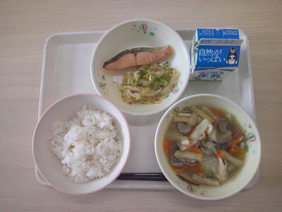 麦ご飯、牛乳、だんご汁、塩鮭、白菜のカツオ和え