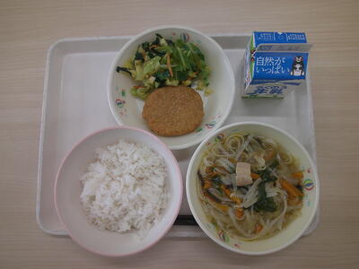 麦ご飯、牛乳、マーボー豆腐、茎わかめともやしの中華和え