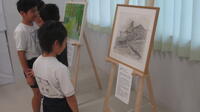 菊池恵楓園の絵画クラブ「金陽会」で現在も描き続けられてる方は2名ですが、これまでの作品も含め20点近くの絵画展示がされています。油絵中心ですが、鉛筆や色鉛筆、クレパスで描かれているものもあります。色使いや構図も工夫があり、子どもたちはお気に入りの1点を決めていました。