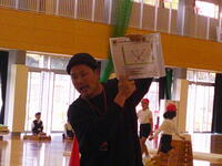 御代志区長の村山さんとじゃんけんで盛り上がっていました。